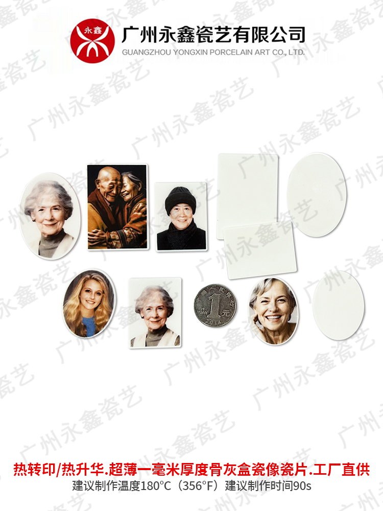 同時(shí)廣州永鑫瓷藝有限公司還在低溫瓷像制作領(lǐng)域處于行業(yè)的絕對(duì)領(lǐng)先地位:專注低溫瓷像機(jī),低溫瓷像瓷片(熱轉(zhuǎn)印瓷片/熱升華瓷片)全球供應(yīng)商(全球規(guī)格最全),低溫瓷像制作無需高溫?zé)疲苯訃娪〕尚停僮骱?jiǎn)易。